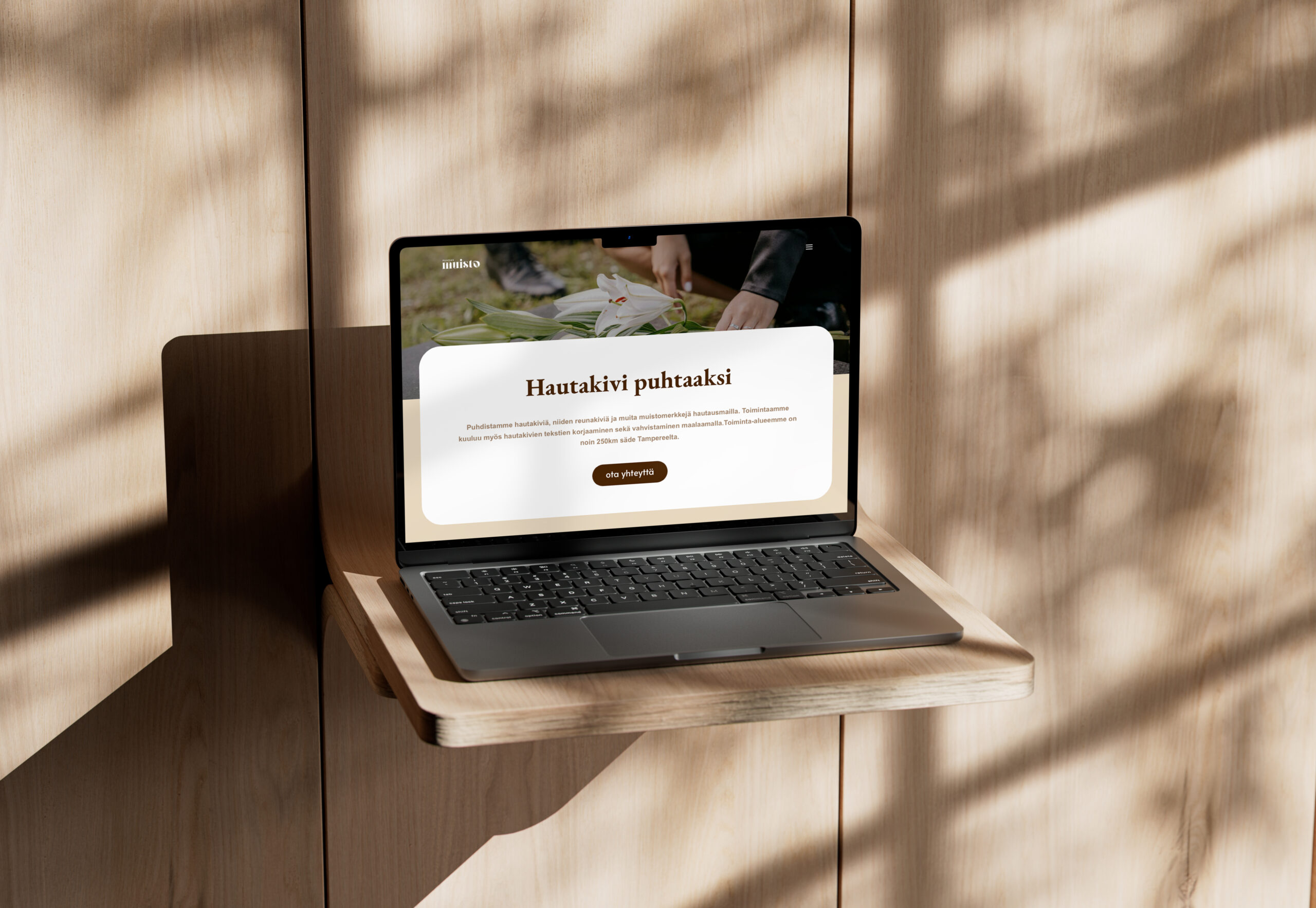 Suunnittelin ja toteutin hautakiviä puhdistalle yritylle logon, yritysilmeen ja verkkosivut. Toiveina oli harmoninen värimaailma ja rauhallinen ulkoasu.